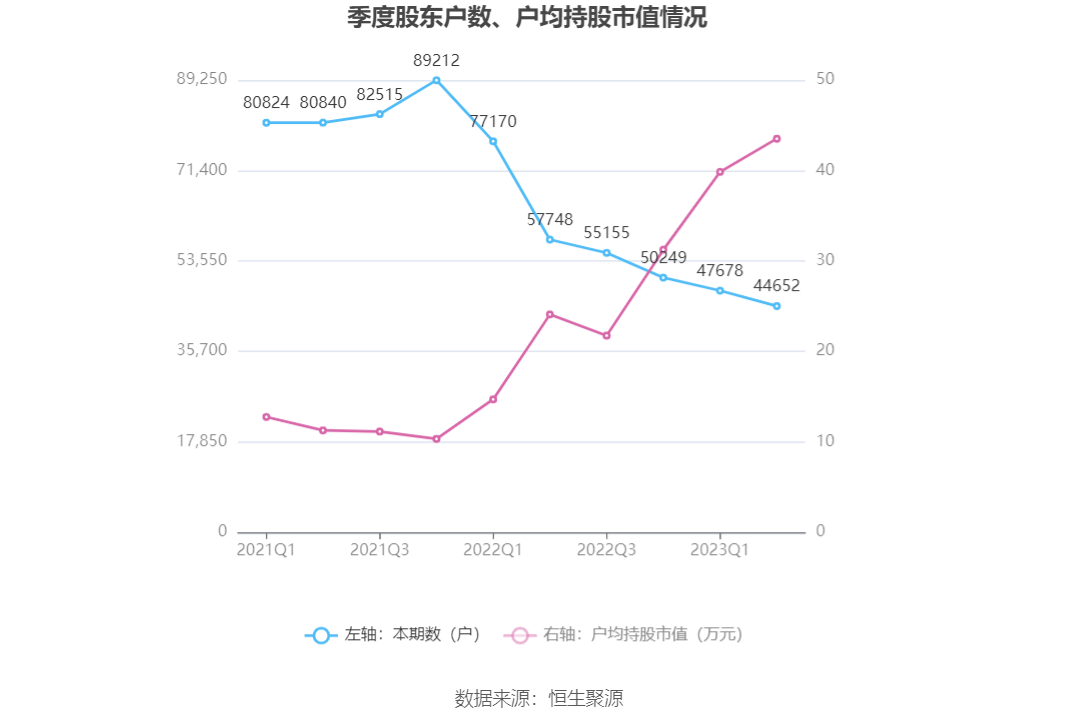 筹码集中度方面,截至2023年二季度末,公司股东总户数为4.47万户,较一季度末下降了3026户,降幅6.35%;户均持股市值由一季度末的39.84万元上升至43.51万元,增幅为9.21%。