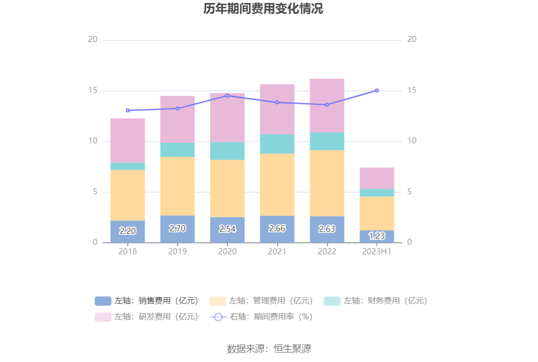 2023年上半年,公司期间费用为7.42亿元,较上年同期减少696.53万元;期间费用率为15.02%,较上年同期下降0.30个百分点。其中,销售费用同比增长8.3%,管理费用同比增长4.44%,研发费用同比下降7.88%,财务费用同比下降14.32%。