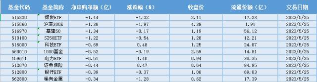 资金流出方面,25日净赎回金额最多的是煤炭ETF(515220),赎回金额1.44亿元。另外还有沪深300ETF(515660)、基建50(516970)、SZ50ETF(510100)赎回金额超1亿元,赎回金额分别为1.38亿元、1.34亿元、1.22亿元。其余ETF赎回金额相对较小,均未超过1亿元。