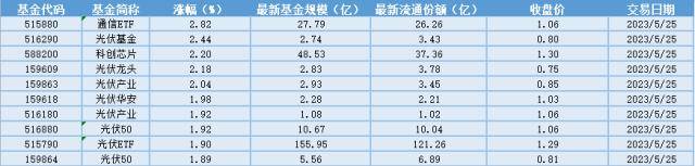 5月25日场内ETF基金涨幅中,通信ETF(515880),涨幅2.82%。光伏基金(516290)、科创芯片(588200)、光伏龙头(159609)等光伏ETF排名靠前。5月25日行业板块中,A股大盘相关的指数ETF成交额较大,科创50(588000)以25.75亿元位居首位,板块涨幅0.95%。国内海外需求共振,光伏装机基本面向好。2022年国内年光伏新增装机87.41GW,同比增长59.3%,其中集中式光伏装机新增36.3GW,分布式光伏装机新增51.11GW。2022年光伏组件累计出口3090.8亿元,同比上升68.1%。2023年1-3月光伏新增装机量33.66GW,同比增长154.81%,其中集中式光伏装机新增15.53GW,分布式光伏新增18.13GW。同时,截至3月底,光伏累计装机也超越水电,成为全国第二大电源。2023年1-3月光伏组件累计出口901.4亿元,同比上升23.6%,海外需求向好。展望后市,产业链价格下降有望提高光伏电站收益,刺激下游需求,光伏装机有望维持高增速,光伏ETF大涨。