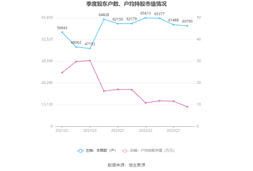 筹码集中度方面,截至2023年二季度末,公司股东总户数为6.08万户,较一季度末下降了698户,降幅1.14%;户均持股市值由一季度末的11.66万元下降至9.05万元,降幅为22.38%。