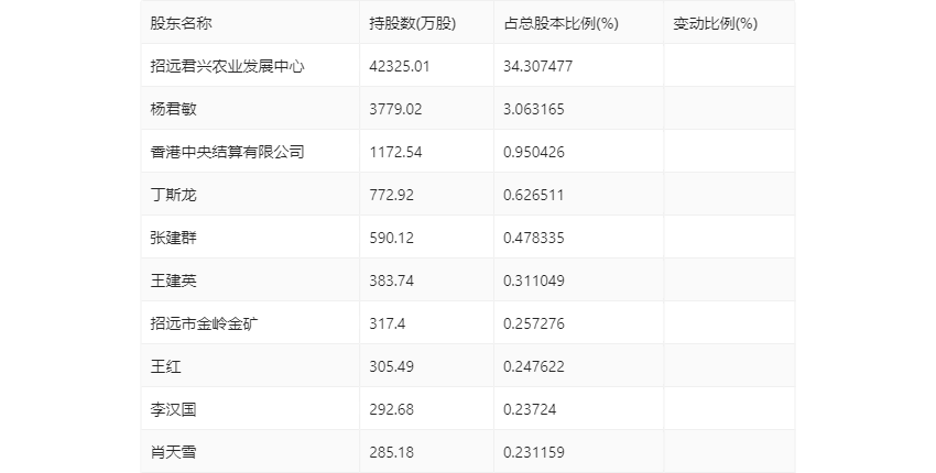 半年报显示,2023年上半年末的公司十大流通股东中,新进股东为丁斯龙,取代了一季度末的傅津津。在具体持股比例上,招远君兴农业发展中心、张建群、王红、李汉国、肖天雪持股有所上升,香港中央结算有限公司、王建英、招远市金岭金矿持股有所下降。