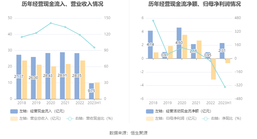 2023年上半年,公司营业收入现金比为95.58%,净现比为-337.94%。