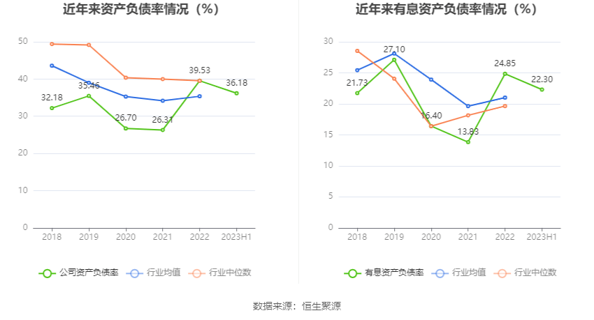 偿债能力方面,公司2023年二季度末资产负债率为36.18%,相比上年末减少3.35个百分点;有息资产负债率为22.30%,相比上年末减少2.55个百分点。