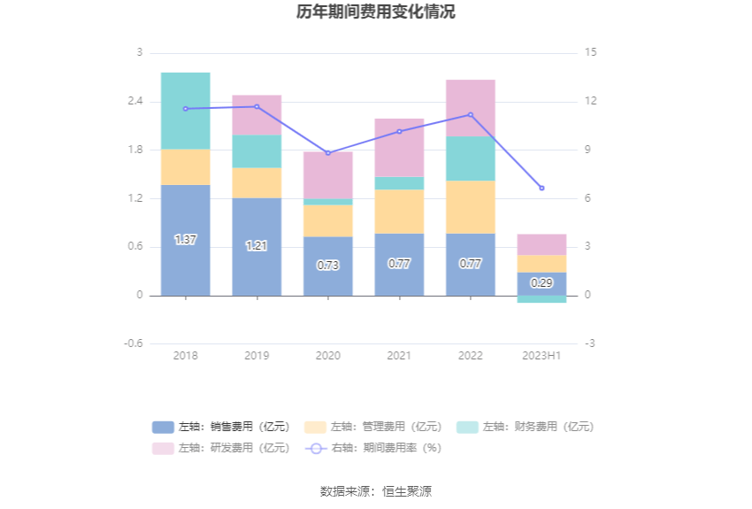 2023年上半年,公司期间费用为6786.06万元,较上年同期减少4069.71万元;期间费用率为6.65%,较上年同期下降2.47个百分点。其中,销售费用同比下降1.19%,管理费用同比下降6.0%,研发费用同比下降11.52%,财务费用由去年同期的2604.06万元变为-948.41万元。