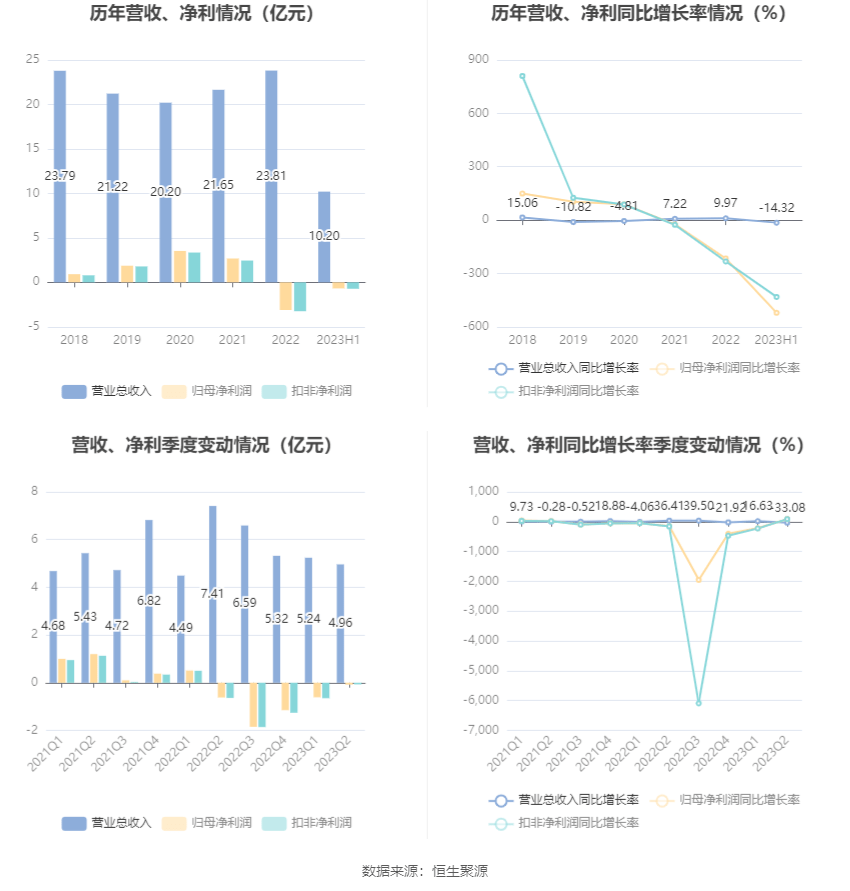 根据半年报,公司第二季度实现营业总收入4.96亿元,同比下降33.08%,环比下降5.33%;归母净利润-777.62万元,同比增长87.56%,环比增长87.17%;扣非净利润-707.17万元,同比增长88.93%,环比增长89.05%。