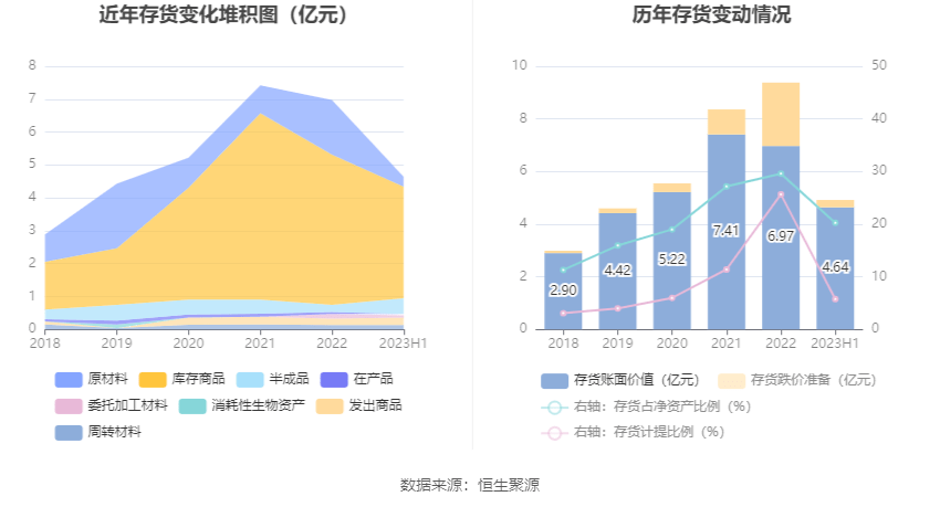 从存货变动来看,截至2023年上半年末,公司存货账面价值为4.64亿元,占净资产的20.26%,较上年末减少2.34亿元。其中,存货跌价准备为2837.45万元,计提比例为5.77%。