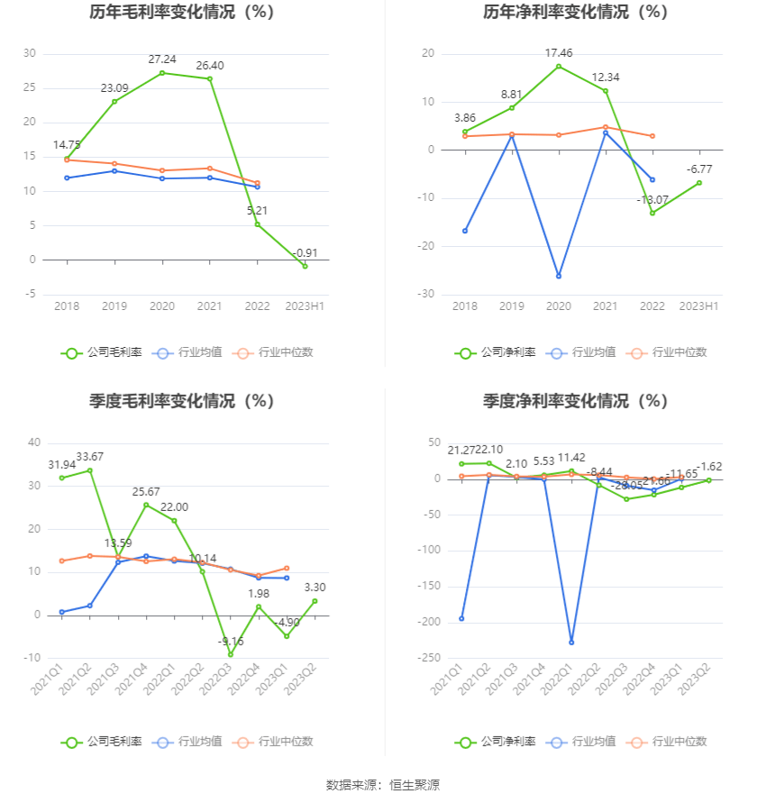 2023年上半年,公司毛利率为-0.91%,同比下降15.52个百分点;净利率为-6.77%,较上年同期下降5.82个百分点。从单季度指标来看,2023年第二季度公司毛利率为3.30%,同比下降6.84个百分点,环比上升8.20个百分点;净利率为-1.62%,较上年同期上升6.82个百分点,较上一季度上升10.03个百分点。
