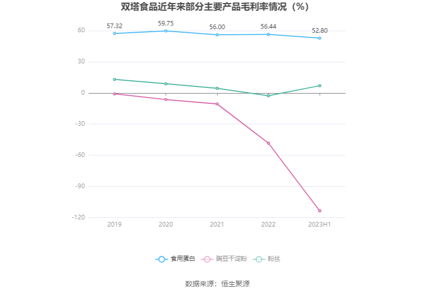 分产品看,食用蛋白、豌豆干淀粉、粉丝2023年毛利率分别为52.80%、-113.54%、6.98%。其中,食用蛋白连续3年下降。