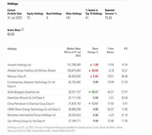截至2023年7月底,基金的 前十大重仓股为腾讯控股、阿里巴巴、美团、宁德时代、药明生物技术、贵州茅台、中国石油化工、隆基绿能、申洲国际、紫金矿业。7月,基金加仓药明生物技术29.27%,加仓中国石油化工13.67%,减持阿里巴巴10.94%,减持美团5.54%,减持腾讯1.00%。