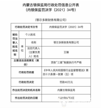 鄂尔多斯集团的经营是很规范的,不过,旗下子公司也偶尔又出事的。根据2021年11月中国银保监会内蒙古银保监局公布的行政处罚信息公开表(内银保监罚决字〔2021〕34号)显示,鄂尔多斯财务有限公司因贷款“三查”制度执行不严格,内蒙古银保监局对罚罚款人民币40万元,处罚日期2021年8月3日。而鄂尔多斯财务有限公司的法定代表人(主要负责人)正是王臻。