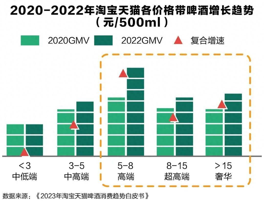 在啤酒市场整体消费升级的趋势下,精酿啤酒崛起。近年来,淘宝天猫精酿啤酒市场规模持续增长,2022年精酿啤酒市场规模突破8亿,消费增速远超传统工业啤酒,是啤酒高端化趋势下的未来增长点。