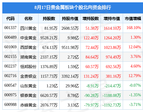 北向资金方面,当日贵金属板块北向资金持股市值为57.71亿元,增持0.34亿元。其中增持最多的是四川黄金,增持了0.16亿元。减持持最多的是赤峰黄金,减持了0.12亿元。贵金属板块北向资金持股变动明细见下表:
