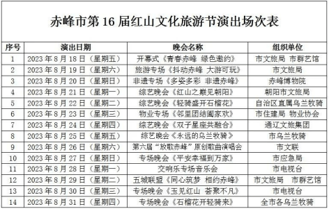 8月18日晚7:30,赤峰市将举办第十六届红山文化旅游节。演出将在新城区玉龙广场盛大开幕,共14场表演,历时14天进行,每场演出均免票向广大市民开放。