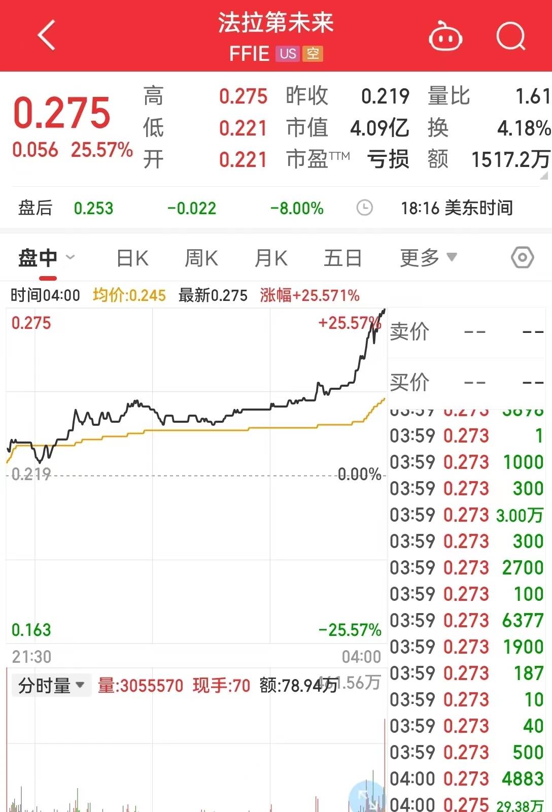 截至当地时间8月17日收盘,法拉第未来涨25.57%,报0.275美元,市值4.09亿美元。