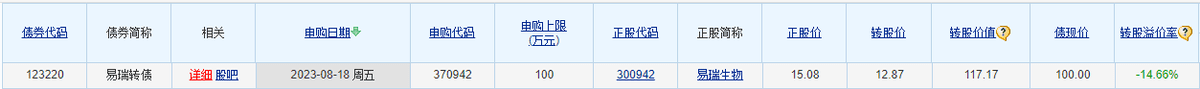 8月18日,可转债打新市场迎来易瑞生物(300942)发行的可转债——易瑞转债。它的发行规模仅3.28亿元,规模很小。债券评级为A+,评级较高。