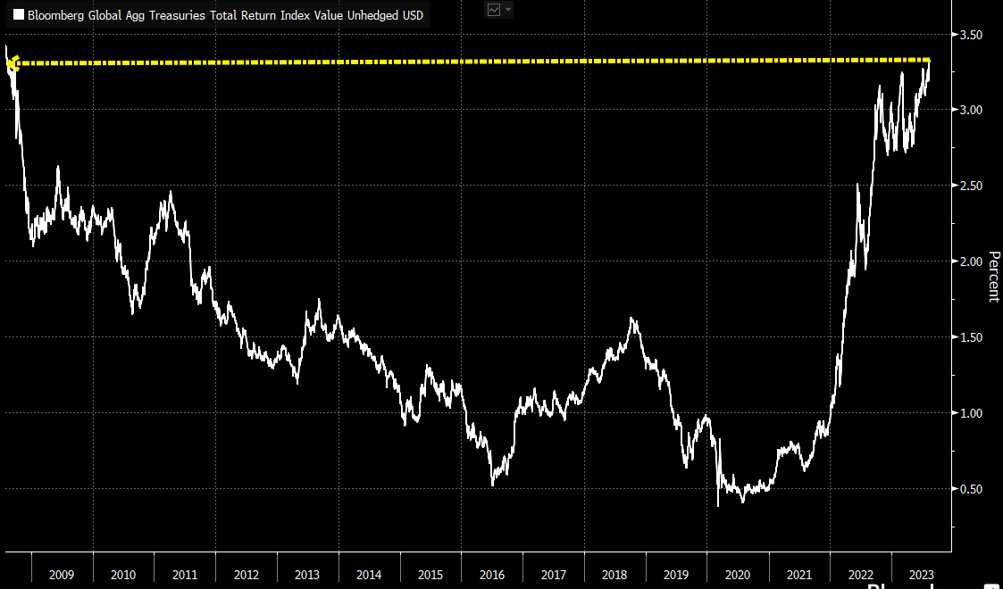 彭博一项全球主权债券总回报指数的收益率周三升至3.3%,创下2008年8月以来的新高。