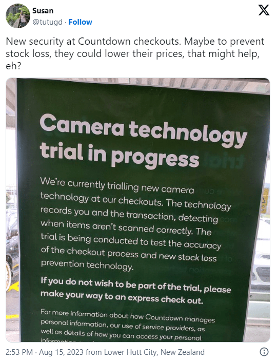 在某些Countdown门店,眼尖的顾客可能会注意到一个张贴的标志,上面显示正在进行“摄像头技术试验”。