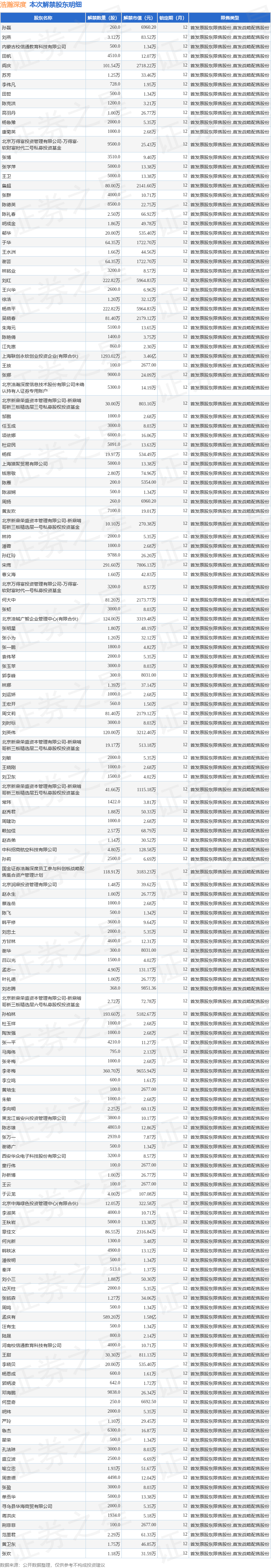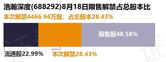 根据市场公开信息整理,浩瀚深度(688292)于8月18日将有4466.94万股限售股份解禁上市,为公司首发原股东限售股份,首发战略配售股份,占公司总股本28.43%。最近一年内,该股累计解禁3613.32万股,占总股本的22.99%。本次解禁后,公司还有7634.41万股限售股份,占总股本48.58%。具体如下图所示: