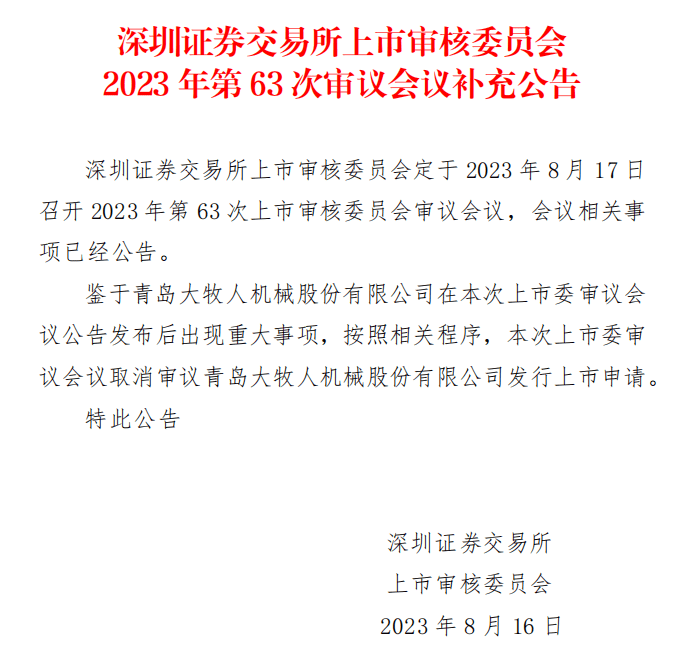8月16日,根据深交所上市审核委员会2023年第63次审议会议补充公告,深交所上市审核委员会定于2023年8月17日召开第63次上市审核委员会审议会议,审核青岛大牧人首发上市。因青岛大牧人出现“重大事项”,深交所上市委审议会议取消审议青岛大牧人发行上市申请。