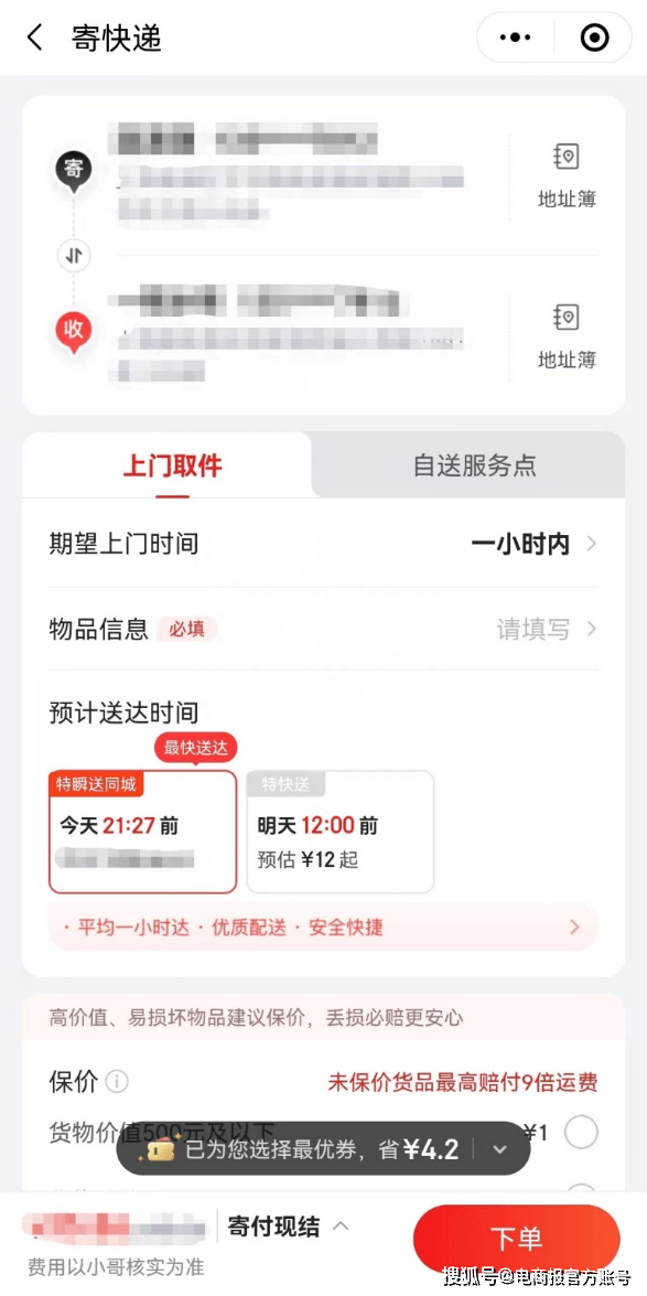 (京东快递“寄快递”页面,同城订单场景下可选“特瞬送同城”。图源达达集团黑板报公众号)