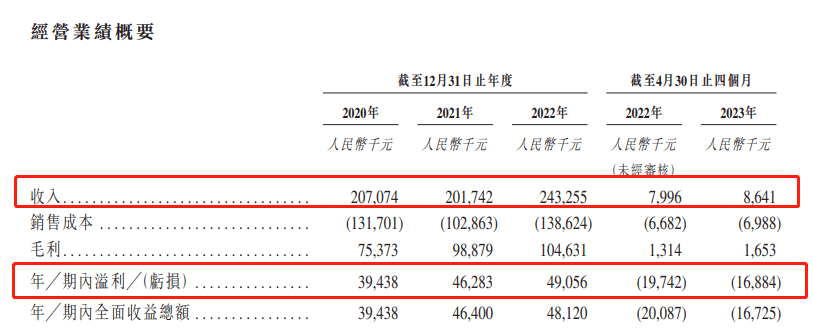 利润方面,2020年-2022年,迈越科技期内溢利分别为3943.8万元、4628.3万元、4905.6万元,毛利分别为7537.3万元、9887.9万元、1.05亿元,毛利率分别为36.4%、49%、43%。2023年前四个月,公司录得期内亏损1688.4万元,和2022年同期亏损1974.2万元相比有所收窄,毛利为165.3万元,毛利率为19.1%。对于亏损,迈越科技表示,主要是公司业务运营受季节性影响。