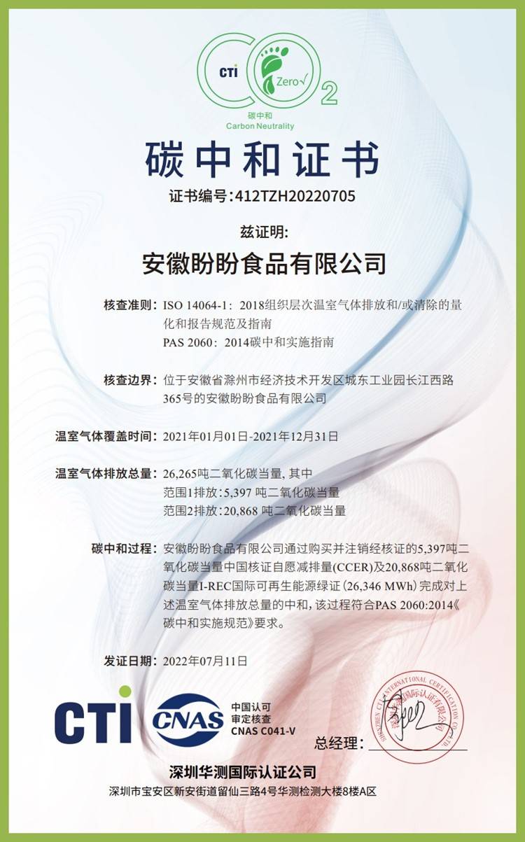 安徽盼盼食品有限公司的碳中和证书