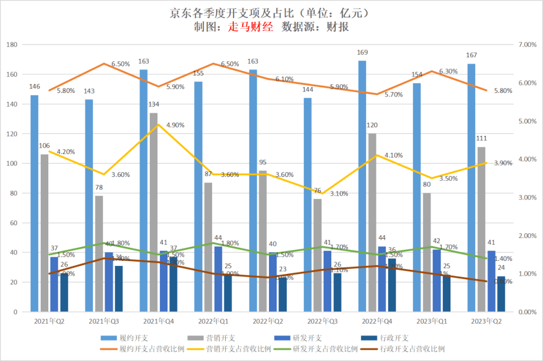 最大的支出项之外,京东在履约、营销、研发、行政支出方面的控制也下足了功夫,因为二季度有618,这是京东的重要节点,所以我们只能同季度同比,京东的人力及行政开支占营收比重,已经下降到了0.8%,都是过去9个季度最低,甚至可能是历史最低;履约开支也是过去三年最低的二季度占比,唯独营销支出比重较去年高,但比2021年下降了0.3个百分点,一方面可能因为百亿补贴项目推升了营销支出比例,另一方面去年Q2受疫情影响,京东减少了很多营销支出。