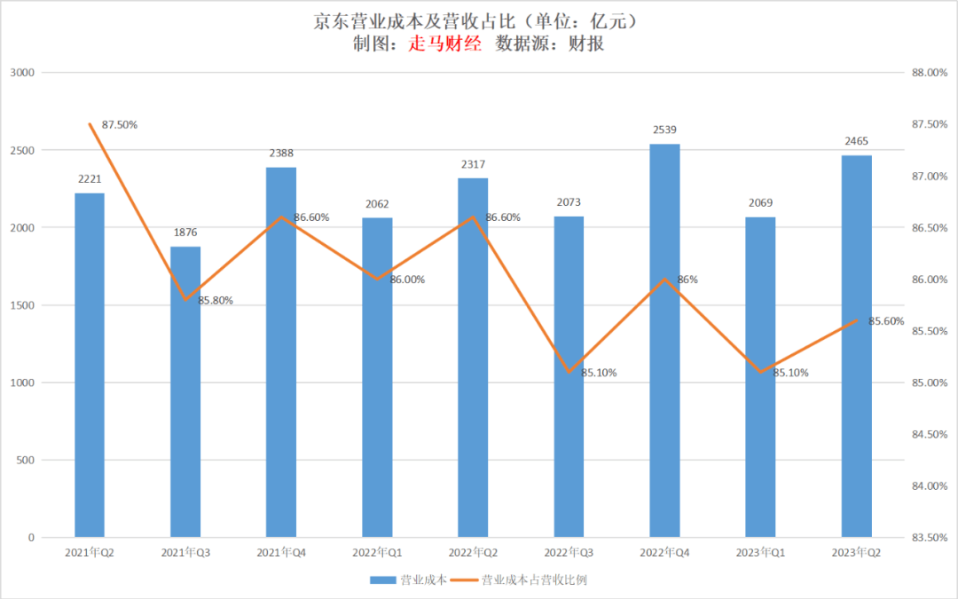 对于京东这样的重资产零售公司来说,营业成本是最大的支出项。二季度营业成本占比85.6%,过去两年的Q2分别是86.6%、87.5%,较2021年Q2下降了大约2个百分点,对于京东这样季度营收接近3000亿体量的公司来说,成本下降2个百分点,意味着60亿的利润或现金流被拧出来了,即便不能说神乎其神,也可以说是难能可贵了。