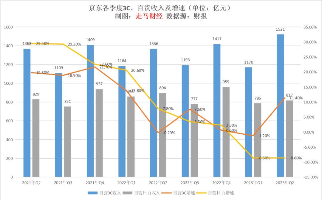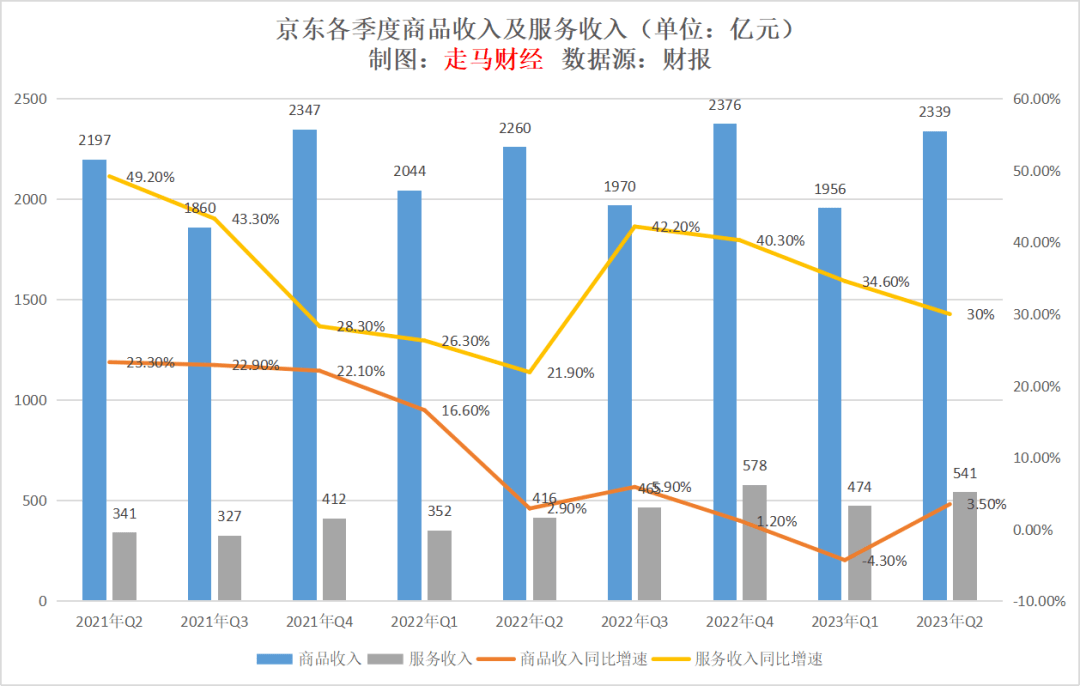 包括3C家电和日用百货在内的自营商品收入2339亿,同比增速3.5%,大幅落后于实物电商行业均速;包括第三方平台佣金、广告和物流等服务在内的收入541亿,同比增速30%,若剔除德邦并表影响,该部分增速为12%。