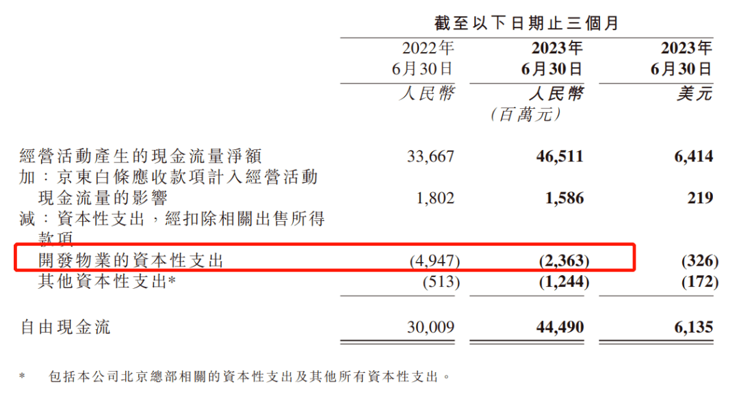 二季度开发物业的资本性支出同比减少26亿,此外还包括可能提升供应商资金占有时间。