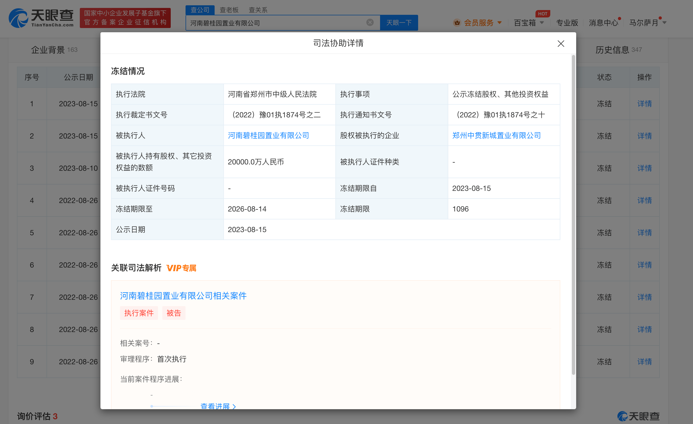 天眼查App显示,近日,河南碧桂园置业有限公司新增2则股权冻结信息,股权被执行企业为郑州高新碧桂园房地产开发有限公司、郑州中贯新城置业有限公司,冻结股权数额分别为4亿人民币、2亿人民币,冻结期限自2023年8月15日至2026年8月14日,执行法院为河南省郑州市中级人民法院。