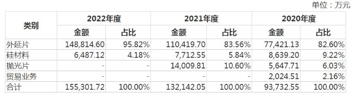 也因此,报告期内,上海合晶的主营业务为外延片,分别实现业务收入7.74亿元、11.04亿元和14.88亿元,到2022年末外延片收入占比超九成;硅材料的业务收入分别为0.86亿元、0.77亿元和0.65亿元,到2022年末占比仅为4.18%。