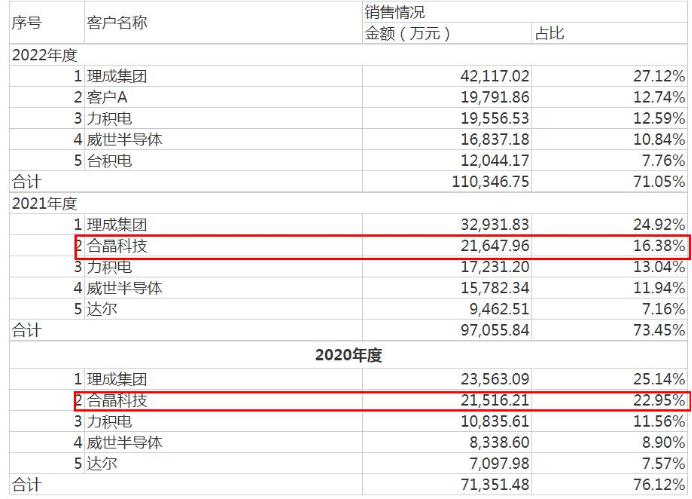 在本次申报的报告期内,上海合晶向前五大客户的合计销售金额分别为7.14亿元、9.71亿元和11.03亿元,占比分别为76.12%、73.45%和71.05%;其中2020年和2021年,合晶科技位居第二大客户,销售额分别为2.15亿元和2.16亿元,同样位居公司前五大客户之列。