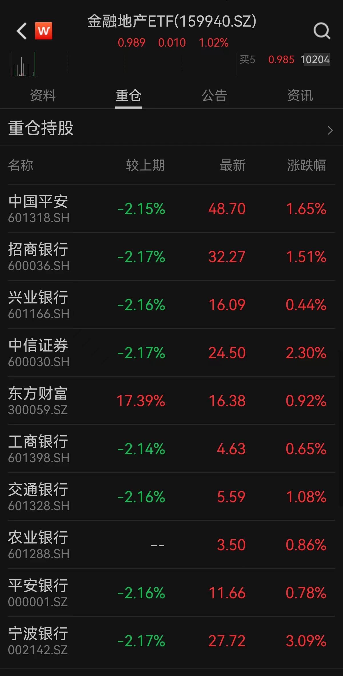 金融地产ETF(159940)前十大权重股集体飘红,其中宁波银行涨超3%,中信证券涨超2%,招商银行、中国平安、东方财富、交通银行涨超1%,工商银行等个股跟涨。