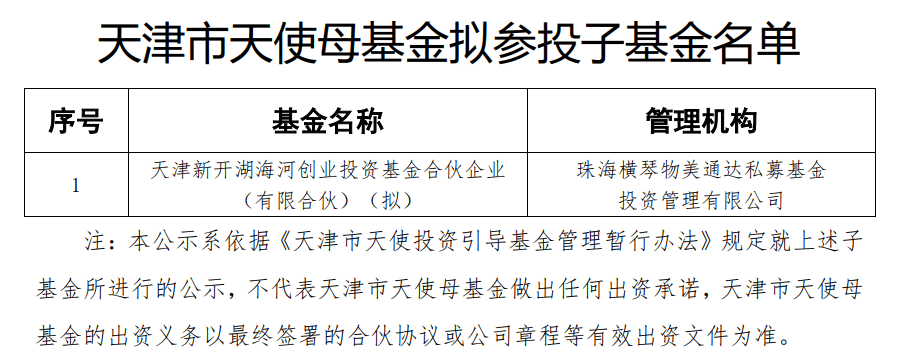 根据《天津市天使投资引导基金管理暂行办法》(津科规〔2022〕4号)、《天津市天使母基金设立方案》(津科金〔2022〕38号)、《天津市市级天使母基金申报指南》等相关规定,经机构申报、尽职调查、投资决策等流程,现对天津市天使投资引导基金合伙企业(有限合伙)(以下简称天津市天使母基金)拟参投的子基金名单进行公示(见附件)。公示期5个工作日。