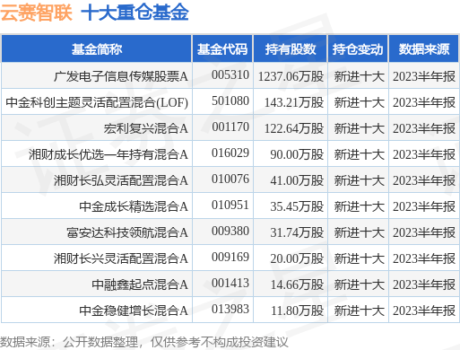 重仓云赛智联的前十大公募基金请见下表: