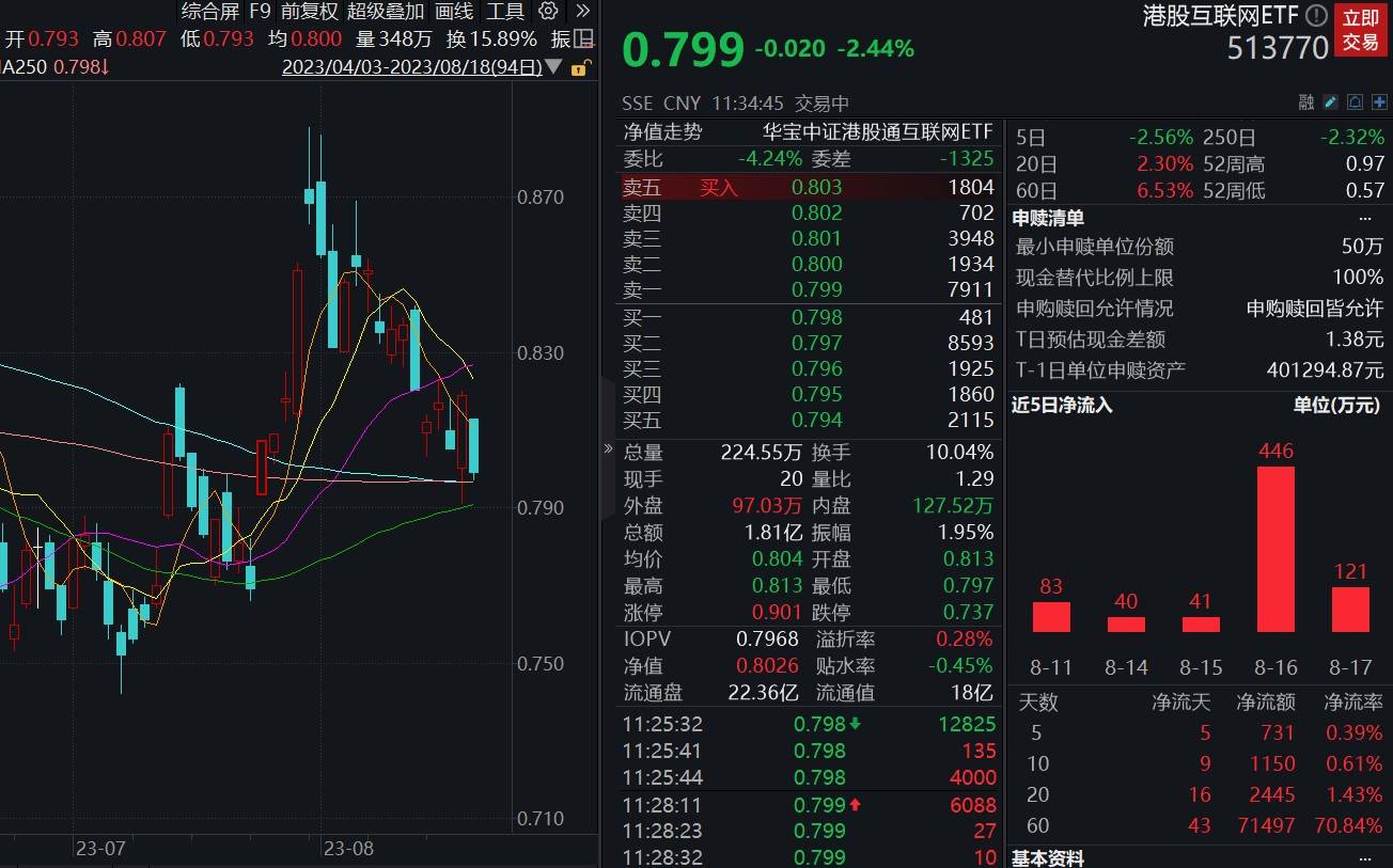 受成份股普跌拖累,港股互联网ETF(513770)早盘低位震荡,截至11:30收盘场内价格跌2.44%,成交额1.81亿元。