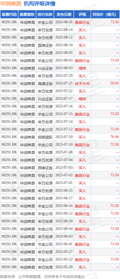 截至2023年8月17日收盘,华润啤酒(00291.HK)报收于47.1港元,上涨4.32%,换手率0.42%,成交量1352.45万股,成交额6.27亿港元。投行对该股的评级以买入为主,近90天内共有19家投行给出买入评级,近90天的目标均价为72.65港元。中金公司最新一份研报给予华润啤酒跑赢行业评级,目标价73.5港元。