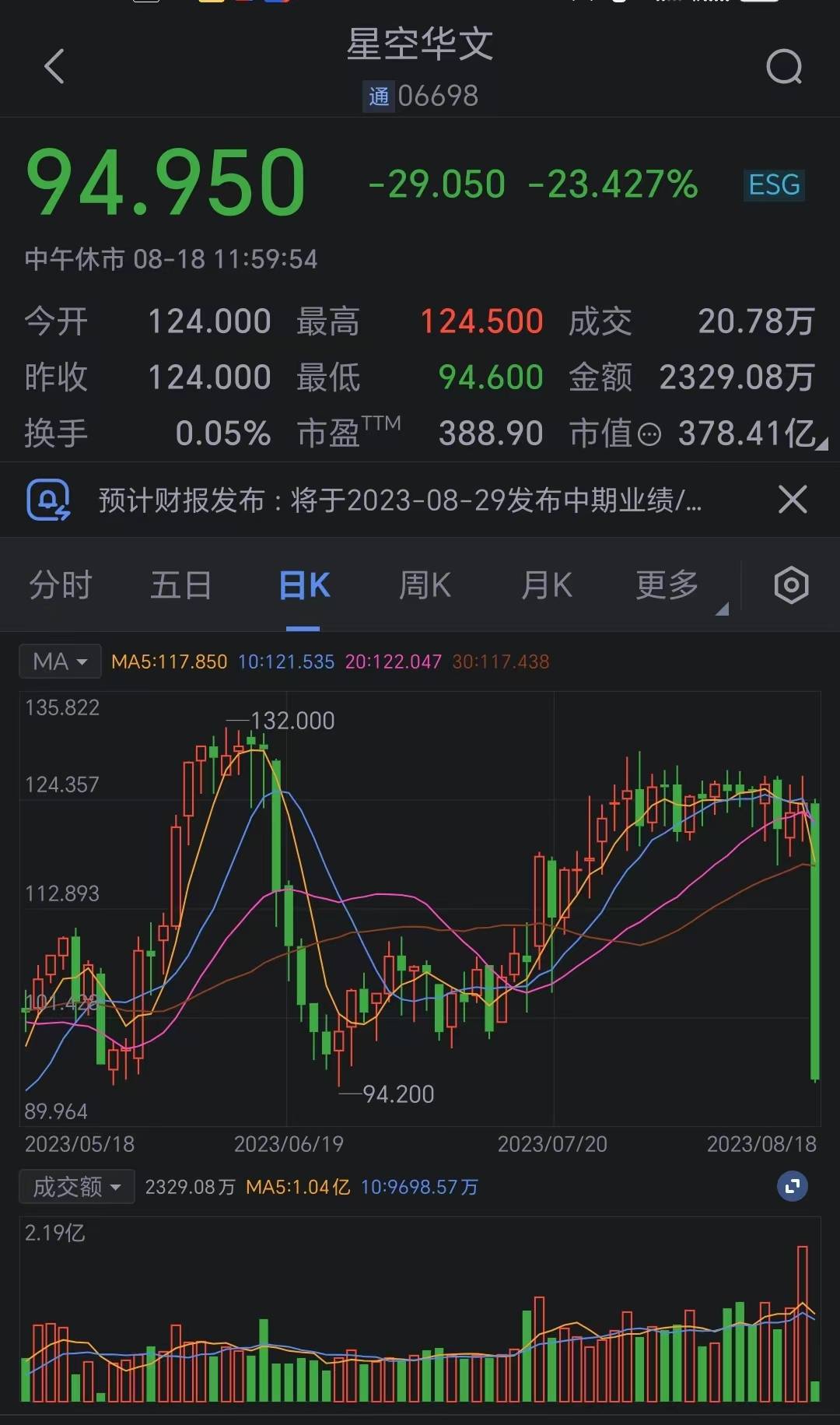 8月18日,《中国好声音》母公司星空华文(HK6698)股价却大跌,截至午间收盘,公司股价大跌23.4%,报94.95港元,总市值为378.4亿港元。
