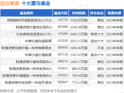 重仓创业慧康的前十大公募基金请见下表: