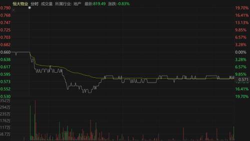 “恒大系”的另一只股票 恒大物业(06666,HK)走势也差不多,平开后一路下滑,最大跌幅超过18%,最低报0.53港元/股,再度创出上市以来的历史新低,之后也有所反弹。截至收盘报0.58港元/股,跌幅12.12%。