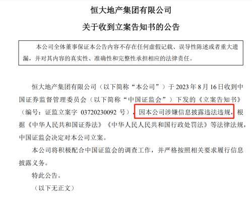 8月16日,恒大地产在上交所、深交所发布收到立案告知书的公告。公告称,公司收到证监会《立案告知书》,因公司涉嫌信披违法违规,证监会决定对本公司立案。