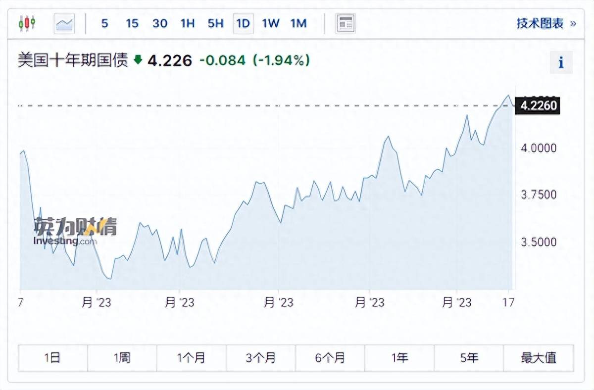 好不容易国内的利空快要跌完了,国际上的利空来了。本周美国国债收益率大幅飙升,基准10年期美债收益率周四收于4.307%,为2007年11月7日以来最高;30年期美债收益率收于4.411%,为2011年4月28日以来最高。