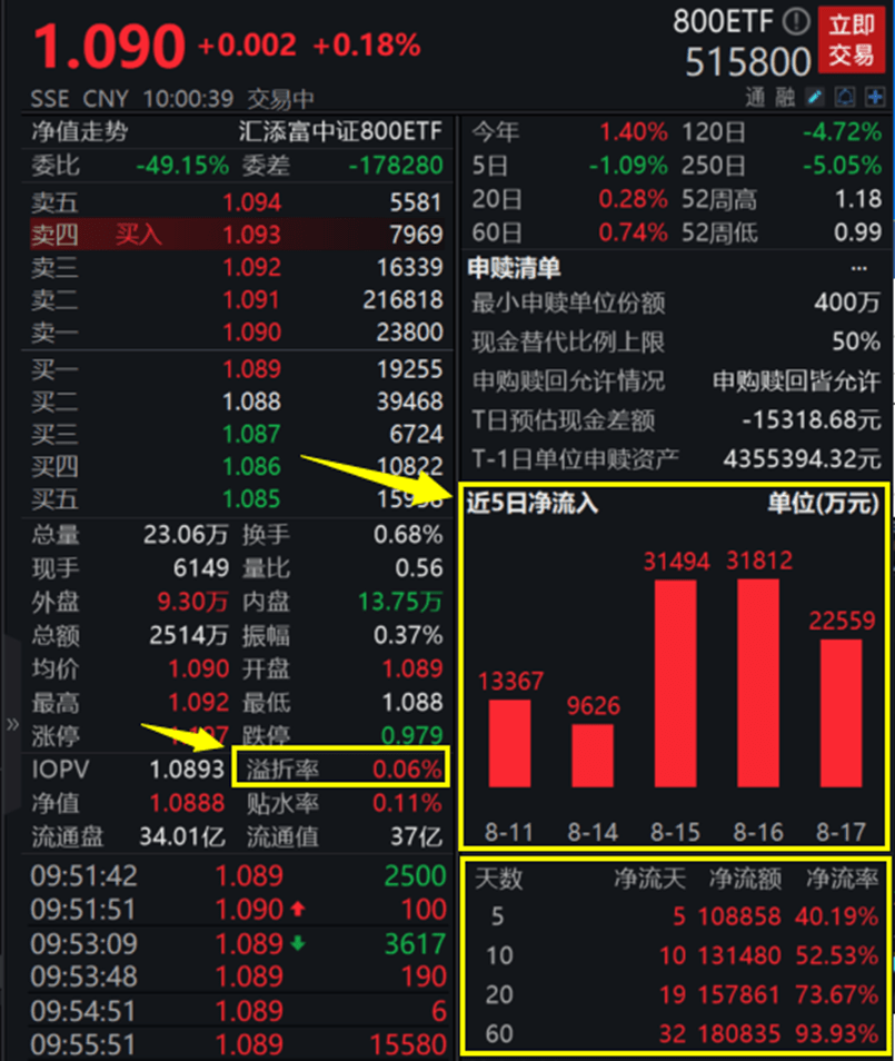 值得注意的是, 800ETF(515800)基金已连续19个交易日净流入,最新单日净流入超2.25亿元,近60日吸金超18亿元,资金净流入率超93%,最新规模超37亿元,资金面异常火爆!