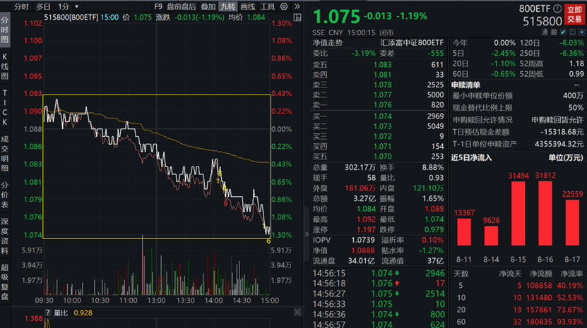 主流ETF方面,A股核心宽基ETF——800ETF(515800)收跌1.19%,全天成交额3.27亿元,基金最新规模超37亿元!800ETF(515800)全天持续溢价交易,买盘力道强劲,反映资金或继续逢跌布局。