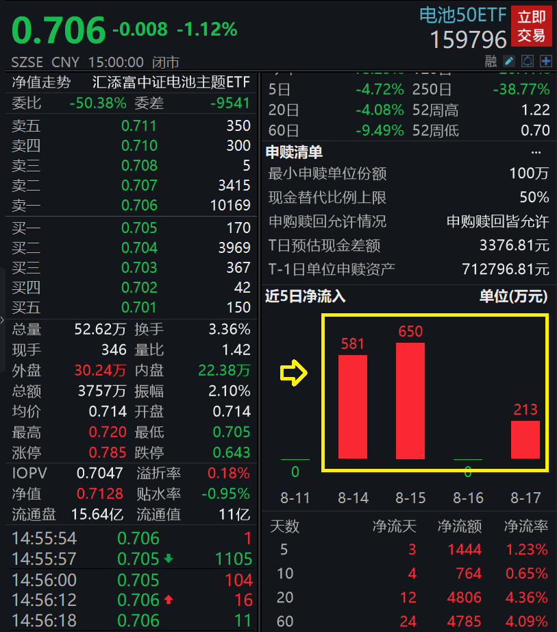 值得重点关注的是,电池50ETF(159796)近期获得资金大幅流入,昨日再度吸金!最近20个交易日共12日获得资金净申购,合计吸金超4800万元!