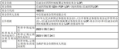(1)为了保护基金份额持有人的利益,本基金管理人决定自2023年5月24日起暂停本基金的申购、定期定额投资业务。