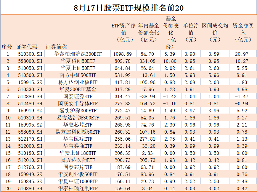 值得一提的是,在8月17日股票ETF规模排名前20的榜单中,华夏基金旗下的产品就占据了5席,分别为华夏科创50ETF、华夏上证50ETF、华夏300ETF基金、华夏芯片ETF与华夏中证1000ETF。