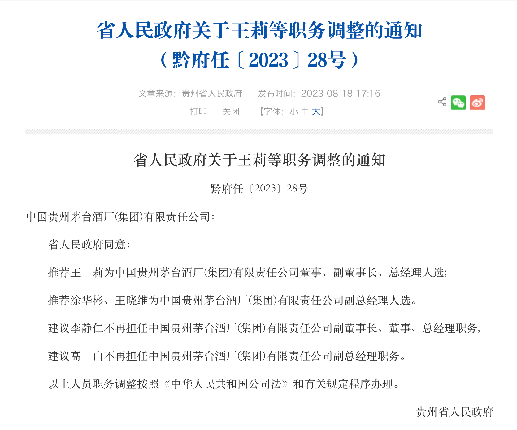 新京报讯(记者薛晨)8月18日,贵州省人民政府官方网站发布通知,对中国贵州茅台酒厂(集团)有限责任公司(以下简称“茅台集团”)王莉等人职务进行调整,同意推荐王莉为茅台集团董事、副董事长、总经理人选。